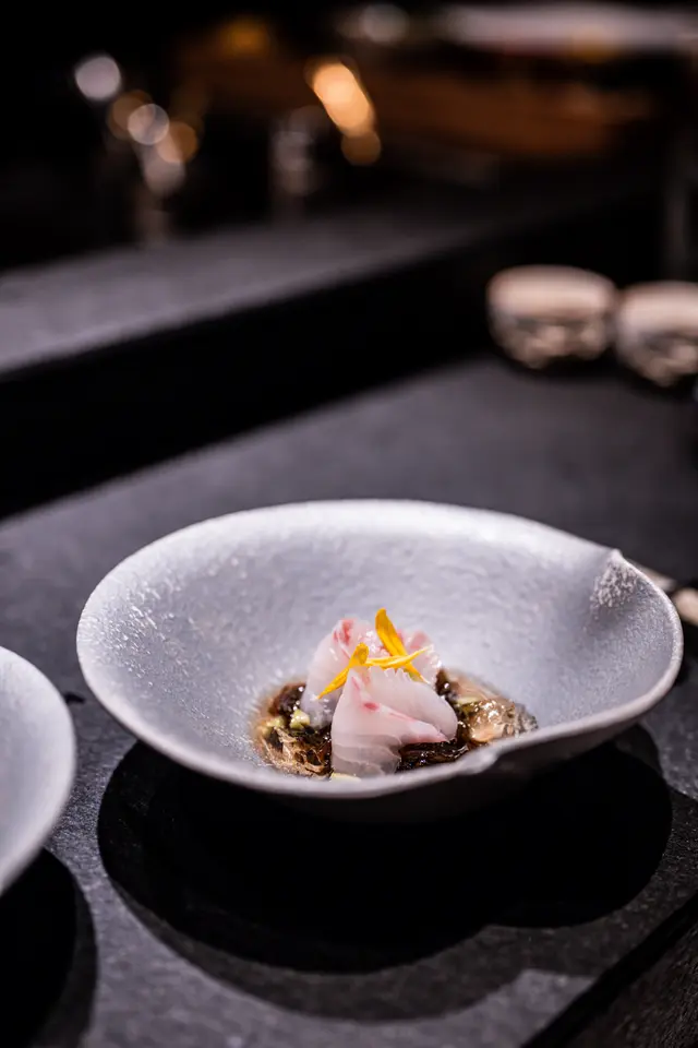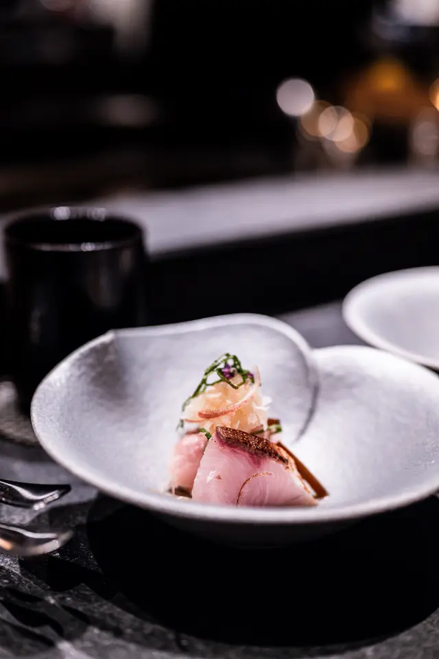 炙燒油甘魚刺身佐大根蓉,魚肉鮮嫩,焦香外層配柚子醋,酸香平衡。另一道的鹿兒島石垣鯛刺身薄透彈牙,搭高湯啫喱,微鹹鮮味增添層次,呈現日式美感。