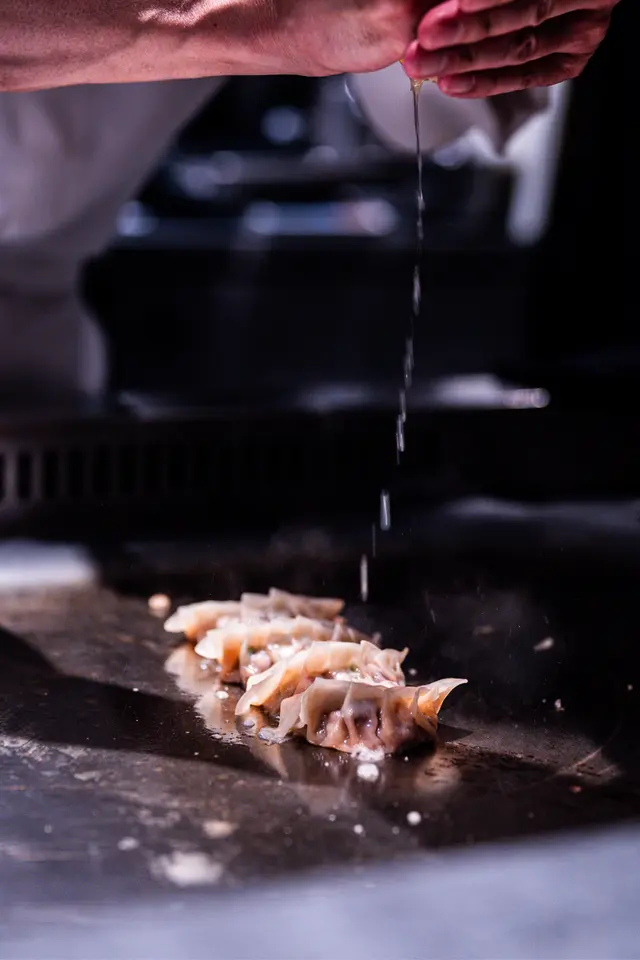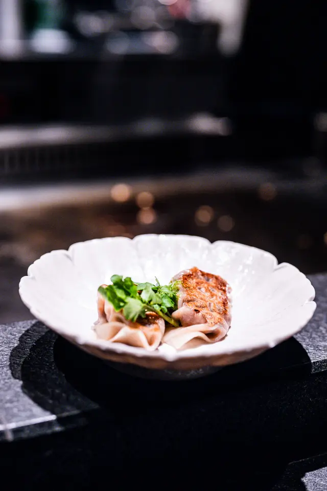 鐵板煎餃子以螢光魷魚及炸蒜為餡,餃皮金黃脆口,帕瑪森奶酪醬汁帶奶香,風味獨特。
