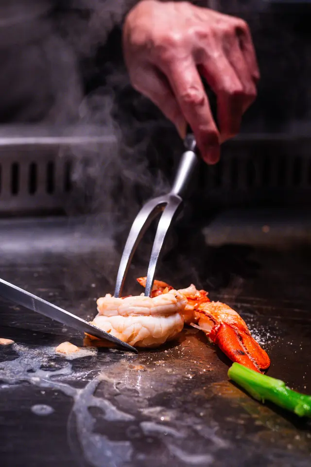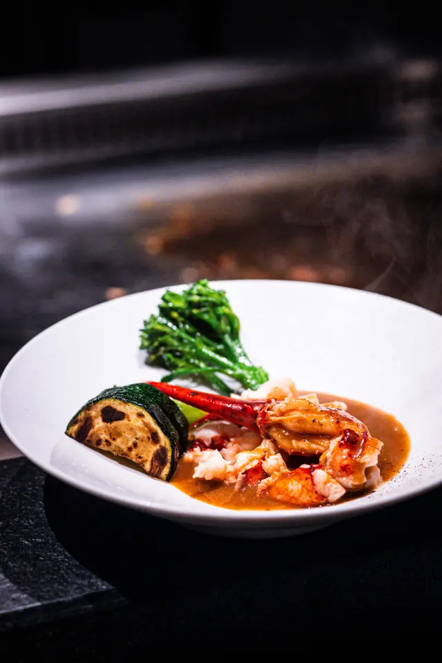 鐵板燒龍蝦尾彈牙鮮甜,濃湯醬汁香滑,烤蔬菜添奢華感,色澤鮮艷。