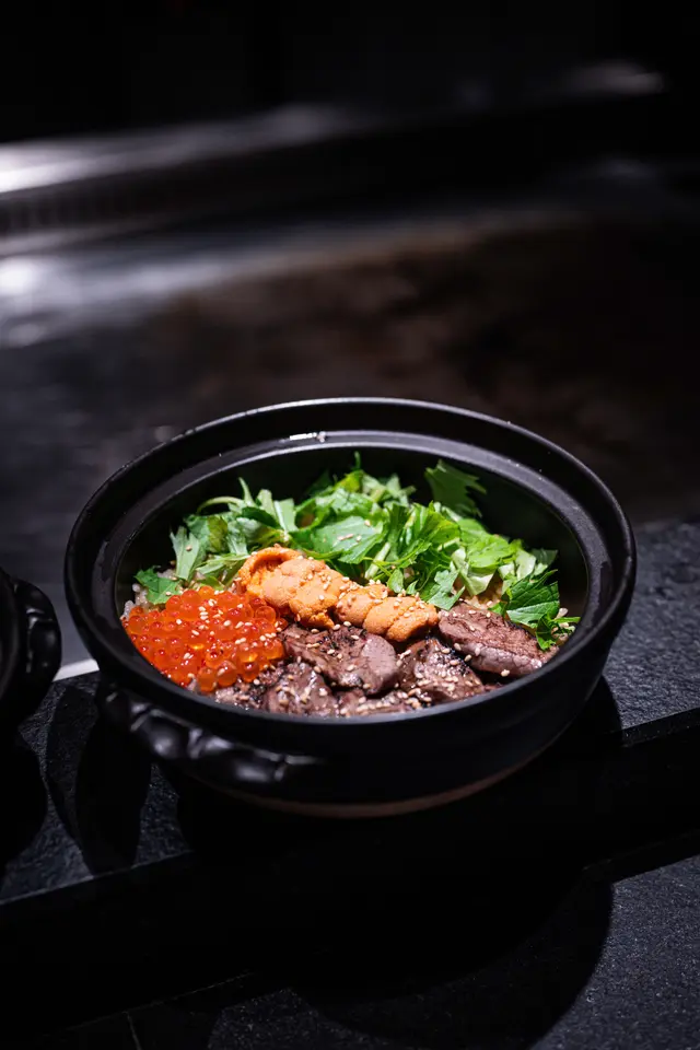 姬牛片海膽釜飯用新潟米慢煮,飯粒軟糯微焦,炙燒和牛與海膽三文魚籽鮮甜鹹香。
