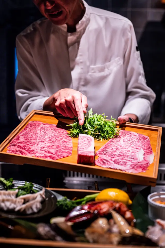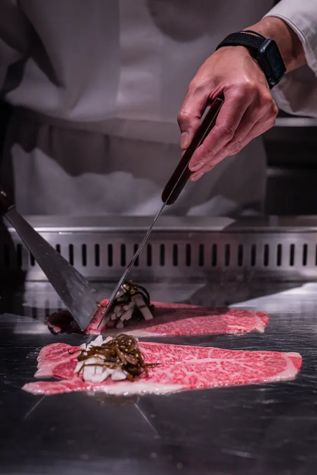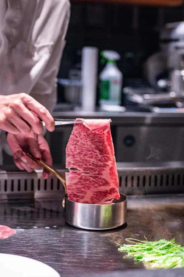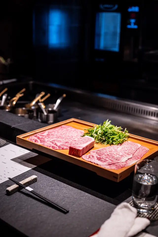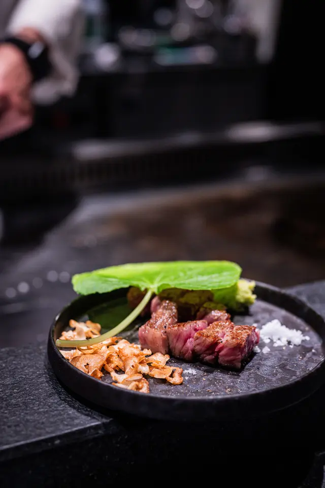 熊本赤牛肋眼扒軟嫩多汁,青森蒜片配山葵海鹽,簡單調味突顯肉香。