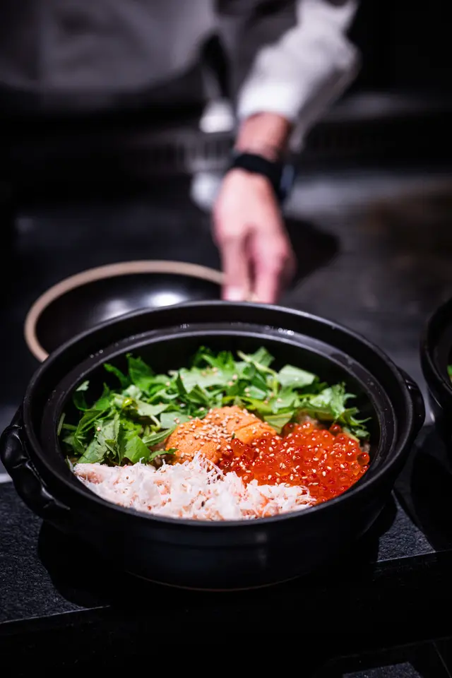 松葉蟹肉海膽釜飯鮮甜細膩,飯底微焦,搭配海膽三文魚籽,熱騰騰上桌,極具吸引力。