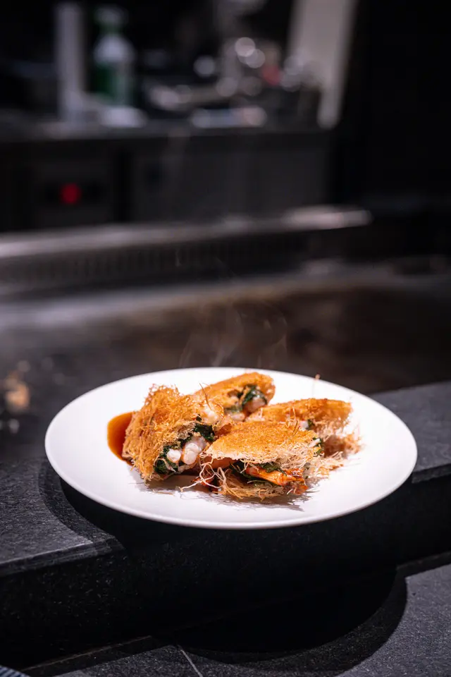 必點新鮮海蝦裹紫蘇葉,卡達伊夫麵條煎脆,蝦肉鮮甜,柚子醋酸爽,口感層次分明。