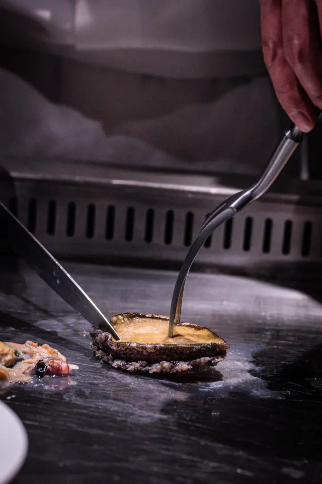 新鮮蝦夷鮑魚鐵板煎香,鮑魚肝醬濃郁,搭配海帶燒茄子,風味和諧。