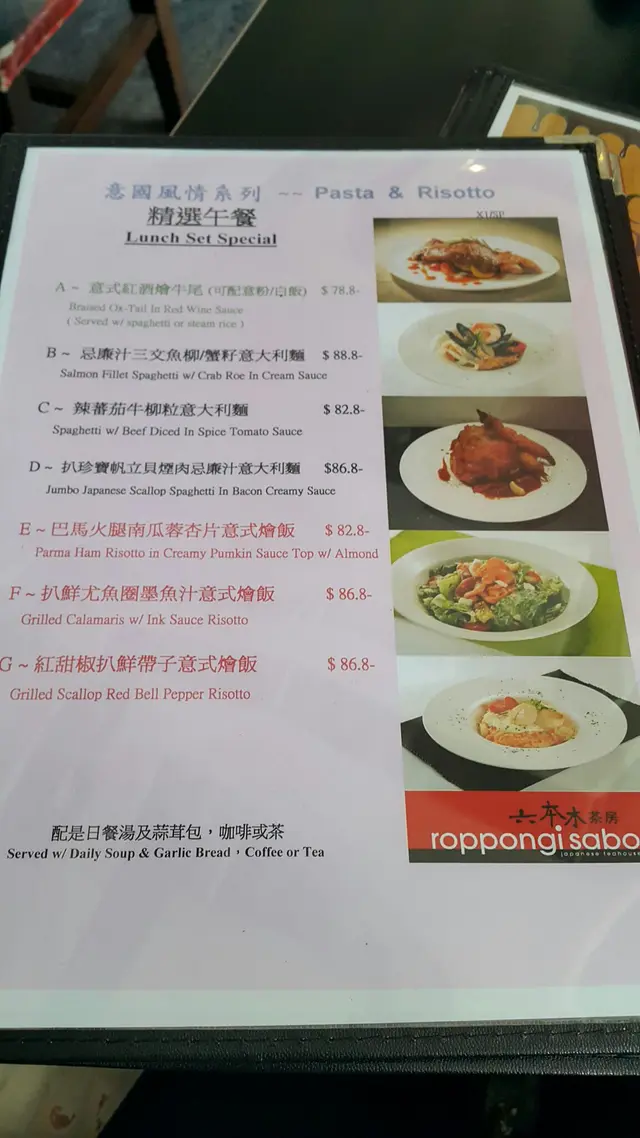 午餐不同價錢,包一客餐湯或沙律,另有餐茶。