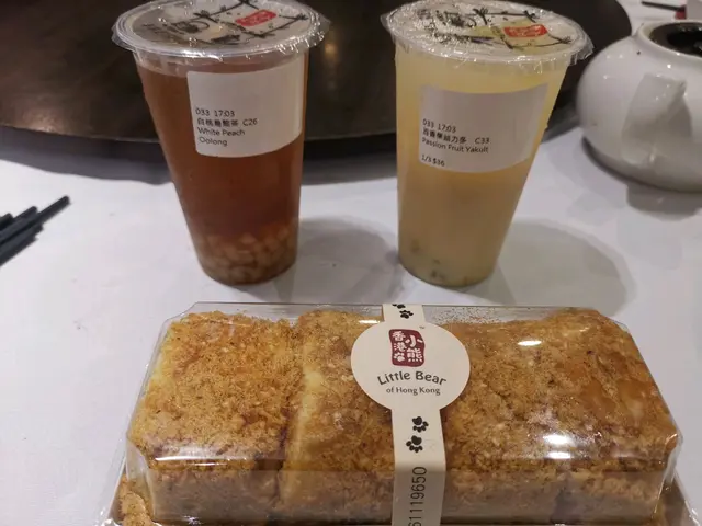 我看看他們的飲品和蛋糕後,就決定買一個蟹黃味肉鬆小方,一杯百香果益力多和一杯白桃烏龍茶回家。