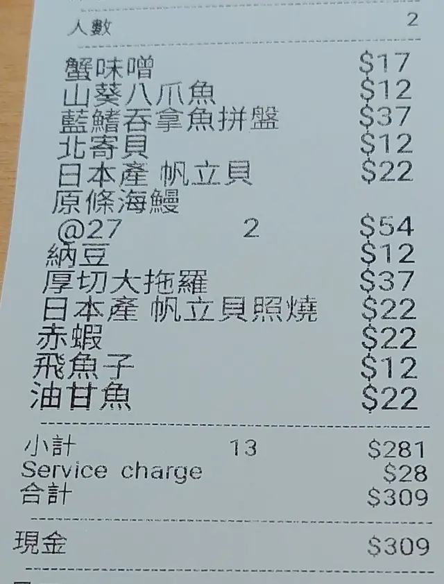 埋單: $309
