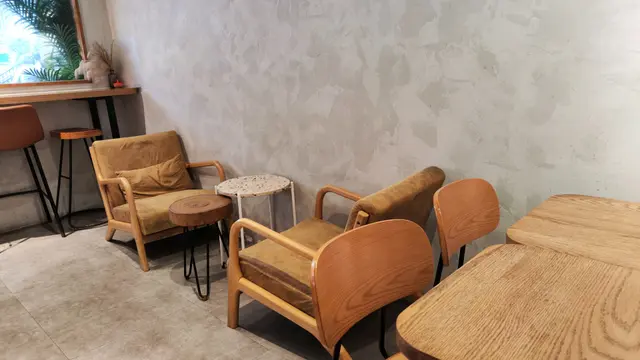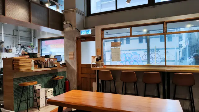 一踏進店內,簡約的木質設計讓人感到舒適。木桌、木椅和木框大窗戶,搭配灰白色牆面和綠色瓷磚吧台,空間明亮通透。大窗戶讓自然光灑進店內,窗外街頭塗鴉和城市景觀與店內溫馨氣氛形成有趣對比。店內座位安排合理,靠窗的高腳桌最適合邊喝咖啡邊看街景,吧台旁的高腳凳則讓人能近距離觀看咖啡師操作,增添互動感。這次到訪時店內顧客不多,環境顯得格外寧靜,適合小聚或獨自放鬆。