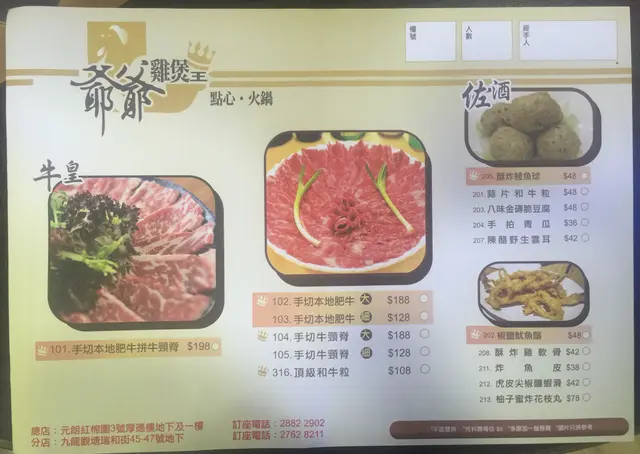既然叫雞煲皇,梗係要試吓爺爺招牌雞煲啦。雞煲用沙茶醬同辣椒油醬做膽,再用上湯蒜頭乾葱炒香雞件煮成,汁底濃郁,帶少少甜味同酒香,辣醬惹味,最緊要雞件新鮮,上枱配芫茜、葱段再煮5分鐘左右已經入晒味,食完渾身和暖,停唔到口。忍唔住連食兩個大雞煲先再叫火鍋料。所以唔係猛龍唔過江,難怪夠膽由元朗開到官塘。
