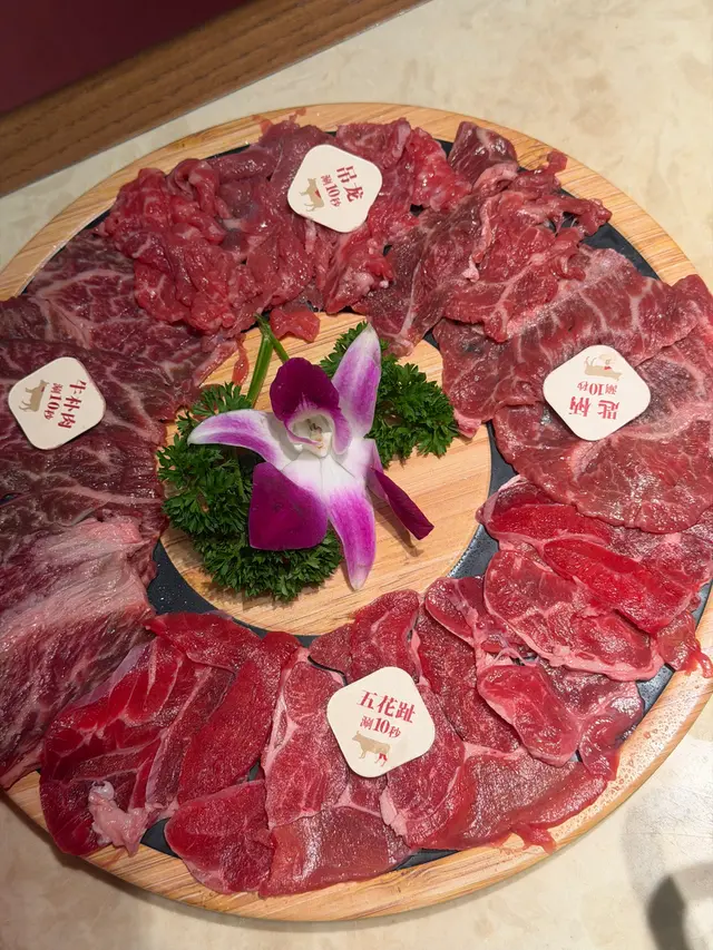 牛肉選擇多樣,牛肉有雪花牛、吊龍、匙柄、五花趾、牛朴肉,每款都係即叫即切,小圓板上,肉質新鮮,油花靚,有小牌仔介紹牛肉種類,涮幾秒就食得,擺盤靚之餘又可以打卡。