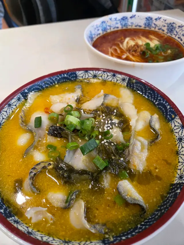 一碗酸菜魚及一碗擔擔麵上枱,酸菜魚的湯底,是偏酸的蕃茄薯仔,湯底沒有任何花椒及其他酸菜魚應有的香料。魚片很多但不夠嫩滑,湯底及味道跟酸菜魚這個名字很不搭配。去到最底有很多黃芽及芽菜。木薯粉不像平時的爽口彈牙,令我更加不想吃。