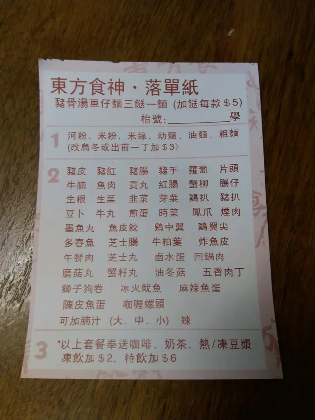 不過不失的車仔麵 bcheung1205等级42018-11-21648 浏览 关注 滙景廣場雖然都幾多野食,但係多數都係連鎖食肆,食嚟食去都真係有啲悶。還好都仲有幾間非連鎖食肆可以選擇,例如今日食嘅呢間車仔麵。車仔麵一碗只係$33蚊,仲要送埋野飲,真係不能要求更多。可以揀嘅餸都其實幾多。今次揀左豬腸,豬扒同埋冰火魷魚,仲加埋腩汁。舖頭都幾乎坐滿人,但都係等左大概十分鐘就有得食。張相影落都真係幾唔靚,但碗面食落其實真係唔錯。冰火魷魚應該都算係呢間野嘅其中一個主打,魷魚食落都好爽口同埋唔會好硬。以上食记乃用户个人意见 , 并不代表OpenRice之观点。赞好分享不過不失的車仔麵 東方食神 https://s.openrice.com/QrLT0coqn00检举 张贴 评分4味道3环境3服务2卫生4抵食用餐途径堂食人均消费$33 (午餐)