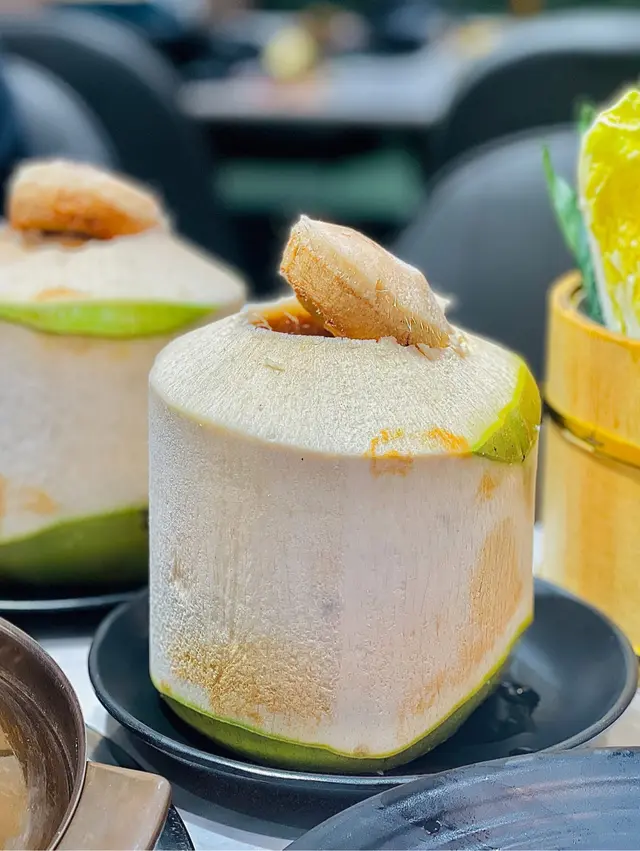 呢個湯底就巴閉囉🤩小哥系我哋面前即場開左兩個大椰青,將裏面d椰青水全部到晒落個大煲度,仲要連椰肉都刮光刮淨咁放埋落去,先再用梨煮雞雞🐔