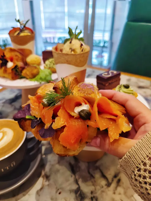 煙三文魚牛角酥,這個份量可以的,牛角酥口感酥脆,吃起來挺香牛油味的。煙三文魚充滿咸香味,跟牛角酥一起吃味道配合,醬汁酸酸的挺開胃。