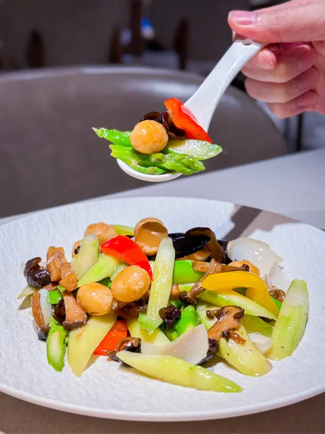 露筍、百合、木耳、果仁等多款爽口嘅蔬菜,配埋雜菇,好吃又夠健康!
