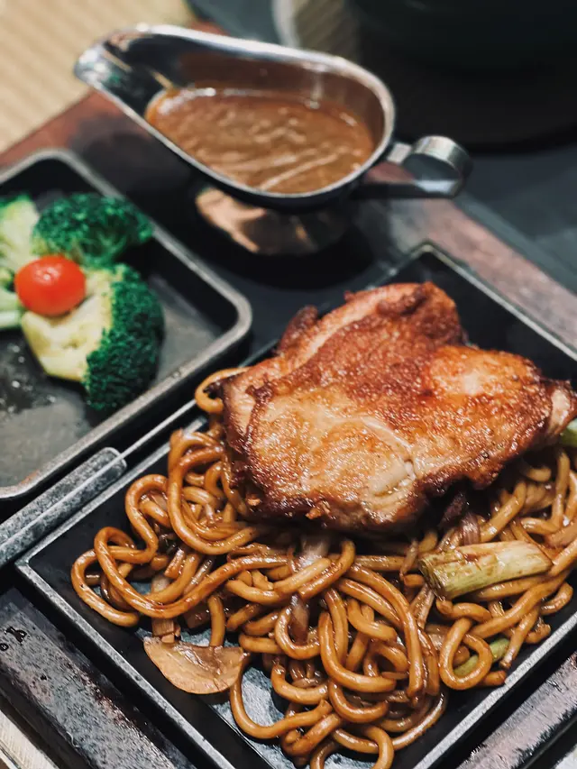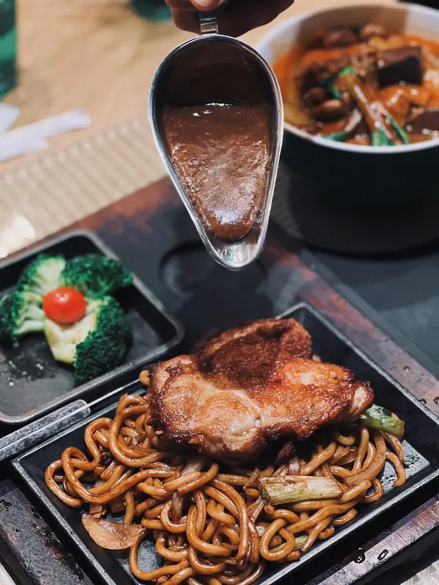 主食方面,朋友叫左個鐵板香脆雞扒炒烏冬 ($108)。嘩!個氣勢好勁,鐵板上枱果下仲滋滋聲響緊!大大塊炸到金黃香脆既雞扒鋪係烏冬上面,份量好足。自己再淋上黑椒汁,香氣即刻爆發出黎!烏冬本身用左香蔥同洋蔥爆炒過,好夠鑊氣,每一啖都好香口。🥘💨