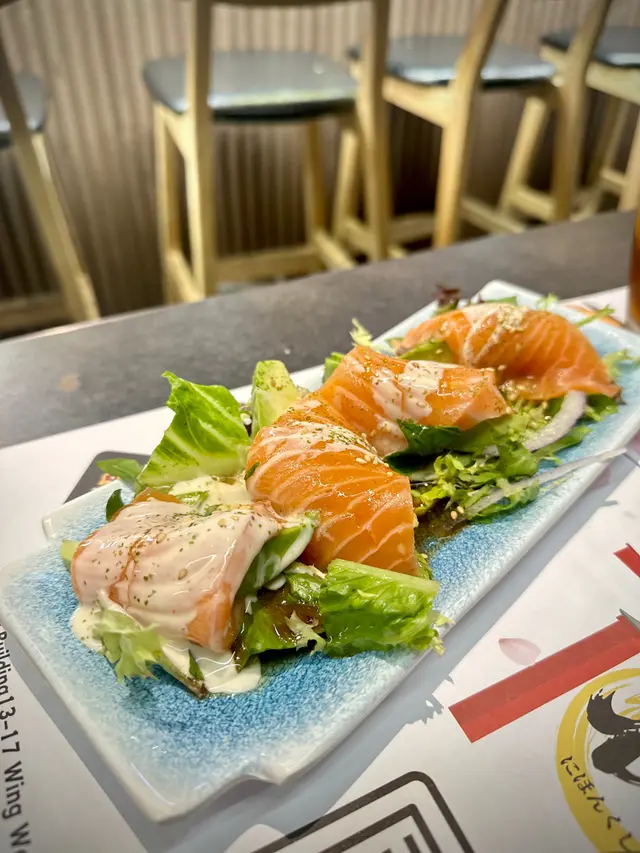 新鮮厚切三文魚配上新鮮優質牛油果,表面淋左日式芝麻醬,底下有沙律菜做加上甜甜酸酸既沙律醋醬汁配搭,食落開胃又帶點滿足感