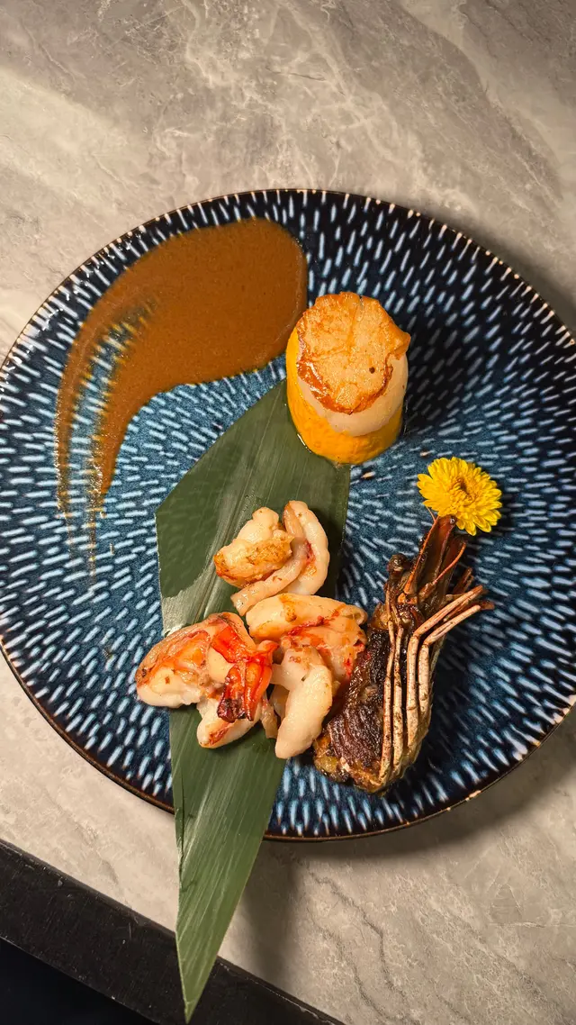 主菜方面,揀左日本元貝、虎蝦、慢煮鮑魚同白鰻