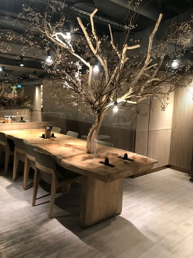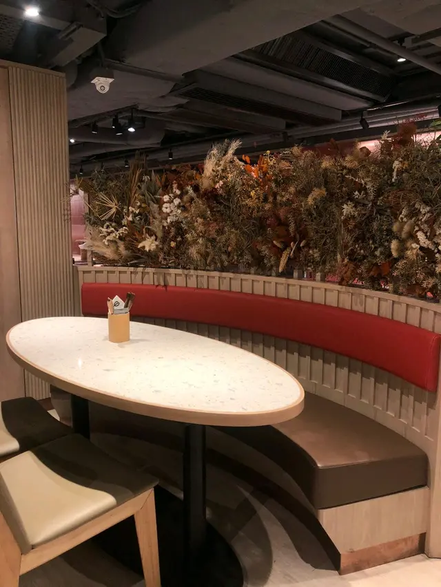 餐廳裝修主打風格是木系日本風,大卡位配上橙色椅墊好醒神,背面還有一大幅仿乾花同草做間隔,真係好岩打卡。