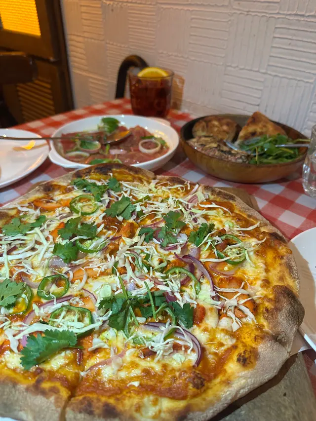 印度香料烤雞 Pizza 🌶️好有驚喜!薄脆嘅餅底烤得好香,上面鋪滿用香料醃製過嘅印度烤雞,帶點微辣但唔會太嗆。最加分係佢配埋酸奶醬,清新嘅奶味中和咗香辣味,食落層次感超豐富,好惹味又唔會膩!🤣~