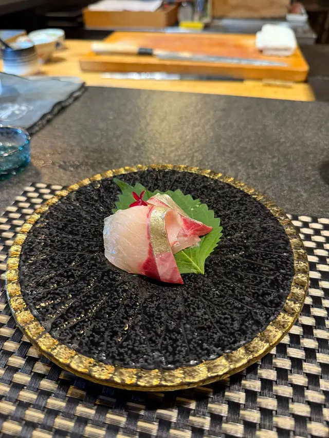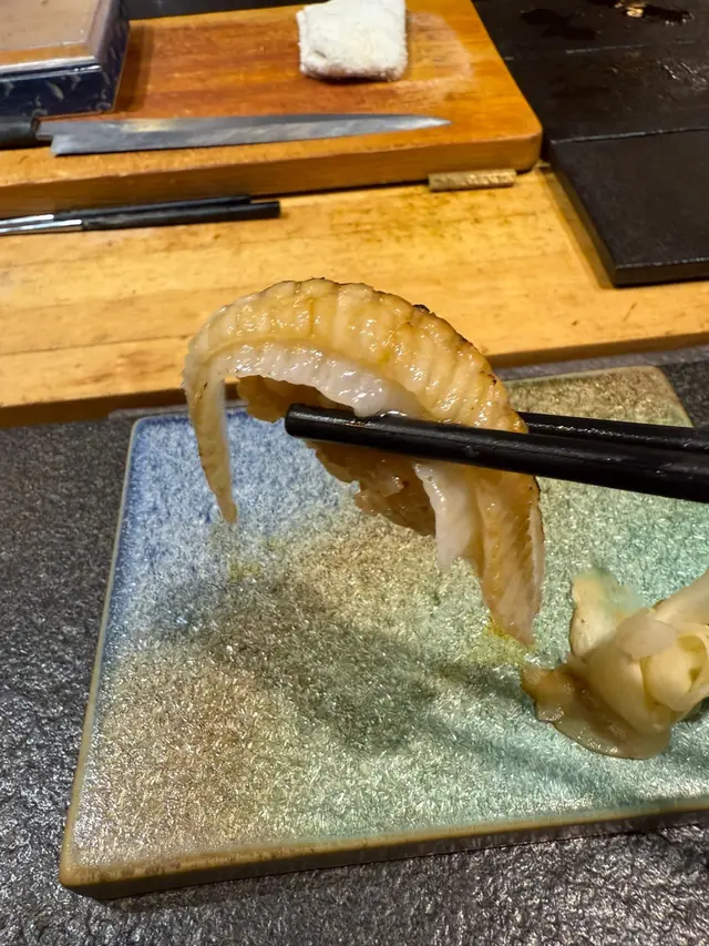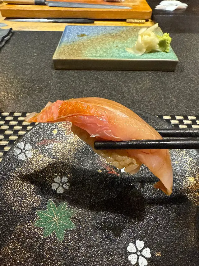 壽司五貫中,北寄貝脆彈、赤蝦黏糯甜潤、金目雕帶焦糖皮香、鰤魚腩霜降油花豐盈,左口魚邊經炙燒後香氣更顯突出。