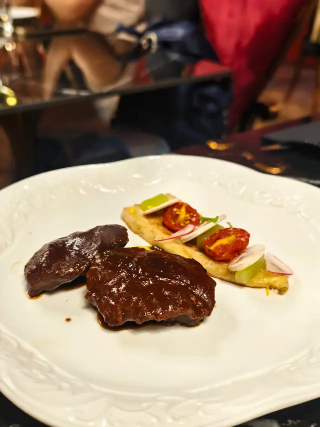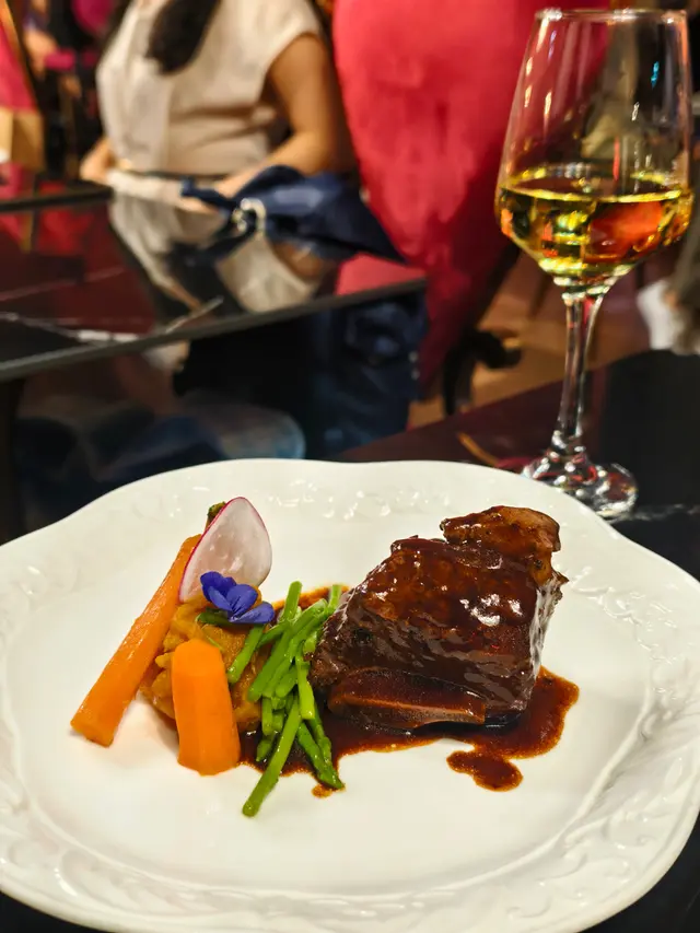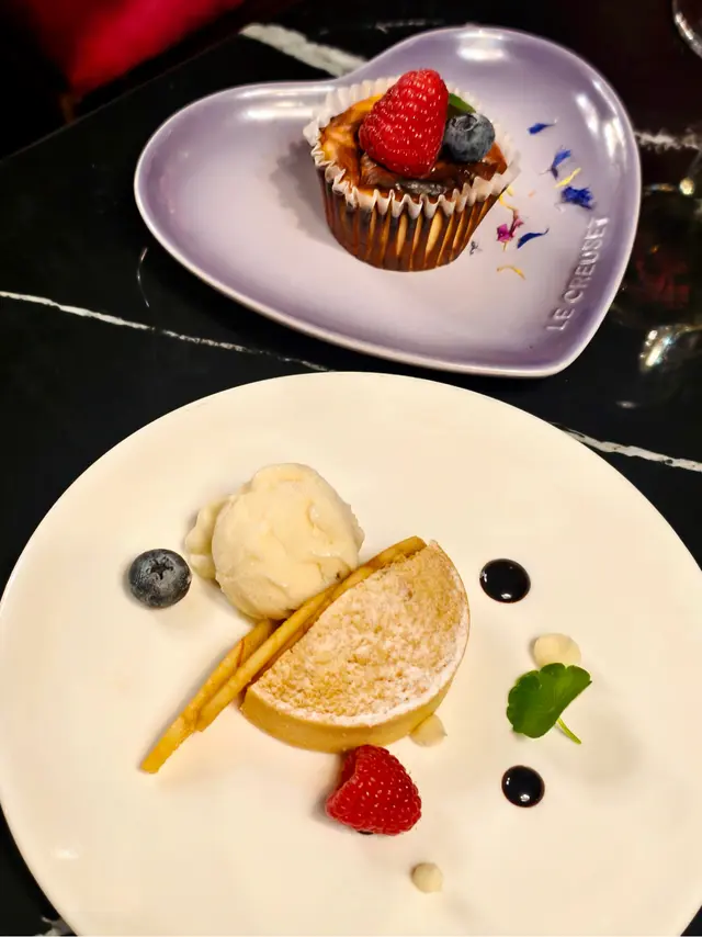 主菜方面,選擇亦豐富,包括威靈頓牛柳、香煎鵝肝配日本A5和牛肉眼(+$198)、寶雲酥澳洲紐西蘭羊架、黃油雞卷海鮮以及香煎比目魚扒等,各具特色。我是牛魔王,選了黑啤極黑安格斯牛肋骨還不錯,但友人選的橡果伊比利亞豬面肉則偏咸。最後是每日精選甜品,芝士蛋糕和蘋果酥(+$28)。6-Course晚餐其實已經非常飽,但愛吃生蠔的話還可以追加生蠔。