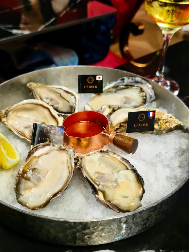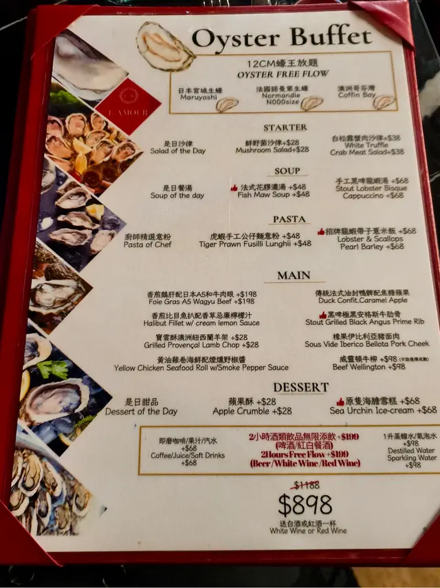 L'AMOUR近期必食Oyster Buffet,12cm蠔王放題套餐,來自不同國家的生蠔,包括有來自日本宮城、法國諾曼第及澳洲哥芬灣等選擇,肉質豐滿,口感滑嫩,海水鮮美,種類因應季節而供應。套餐特價$898 除了生蠔任食,還有前菜、湯、意粉、主菜、甜品,還包一杯自選紅白酒。這夜還試了一杯Rainbow的cocktail drink,打卡一流。