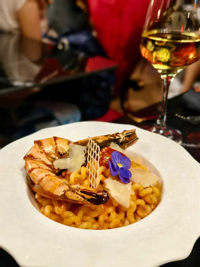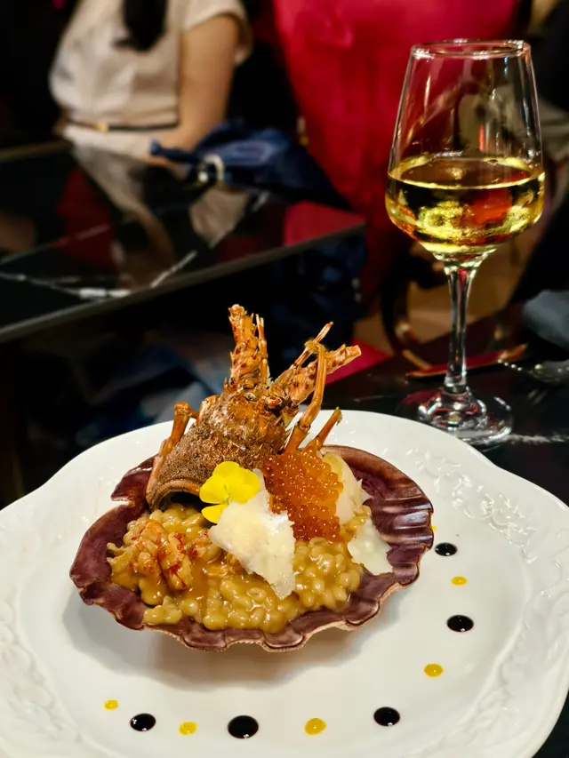 套餐選擇了前菜是日沙律及白松露蟹肉沙律(+$38),餐湯選擇了法式花膠濃湯(+$48)及手工黑啤龍蝦湯(+$68),味道很不錯。主食可選廚師精選手工意粉,但我們選了虎蝦手工公仔麵意粉(+$48)及招牌龍蝦帶子薏米飯(+$68),粗公仔麵狀的手工意粉口感很爽,虎蝦味鮮濃,薏米飯滿是龍蝦湯汁同樣口感彈牙,讃!
