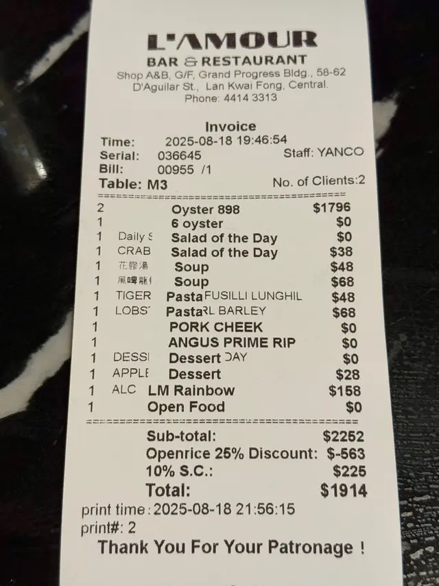 以中環這格調的日法料理而言,加上生蠔任食,有七五折優惠,性價比還不錯。大家可以留意平台,有時會做買一送一優惠添。