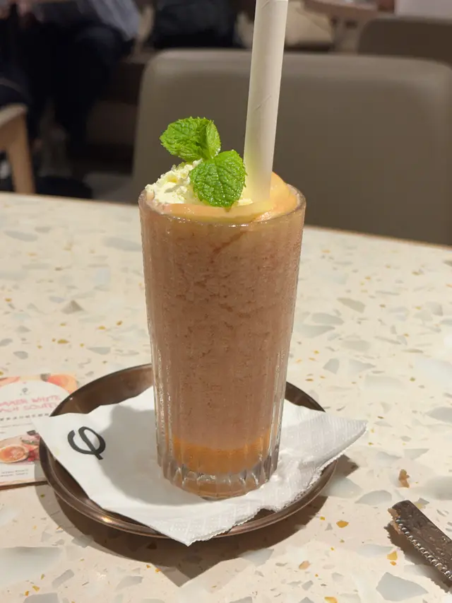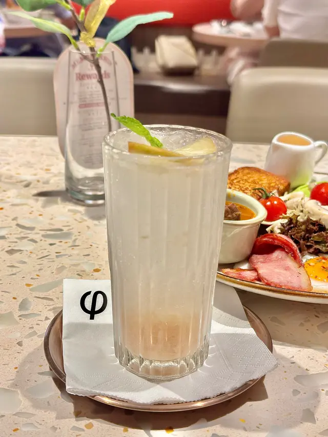 以日本白桃果醬為基底,加入蘇打水與檸檬片,氣泡感強勁卻不嗆喉。杯底沉澱桃肉果粒,喝前攪拌更清涼解膩,搭配梳乎厘完美平衡甜度