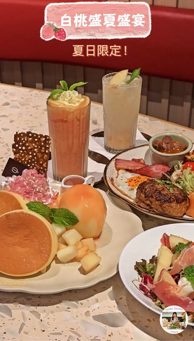 PHI招牌梳乎厘鬆餅現點現焗,需耐心等候20分鐘。上桌時蓬鬆如雲朵,輕晃盤子會「duang duang」抖動!切開內層濕潤綿密,蛋香濃郁如法式舒芙蕾,頂部淋上自製白桃乳酪醬,酸甜清爽,搭配新鮮桃肉與蜜漬桃粒,多重果香交織。隨附香草冰淇淋可冷熱交替食用,層次感十足。