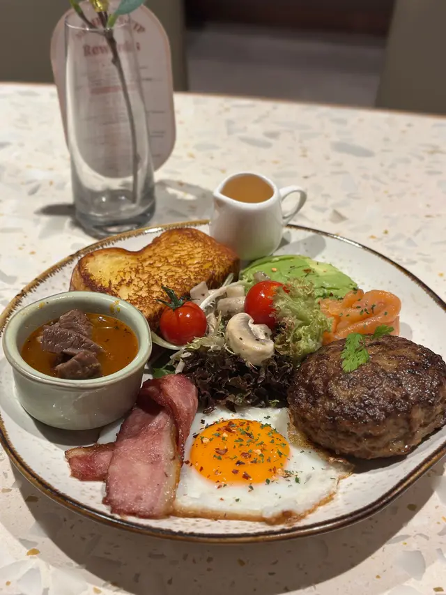 日式洋食風格,厚切漢堡扒肉汁豐盈,混入洋蔥碎增添甜味,搭配太陽蛋、蜜糖煙肉、烤車厘茄及蒜香蘑菇。亮點是楓糖漿,意外與鹹香漢堡扒超搭!麵包烘得外脆內軟