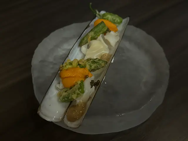 煮物選用蘇格蘭蟶子,搭配輕燙鰹魚湯、奢華的馬糞海膽和魚子醬,及山椒醬提味。