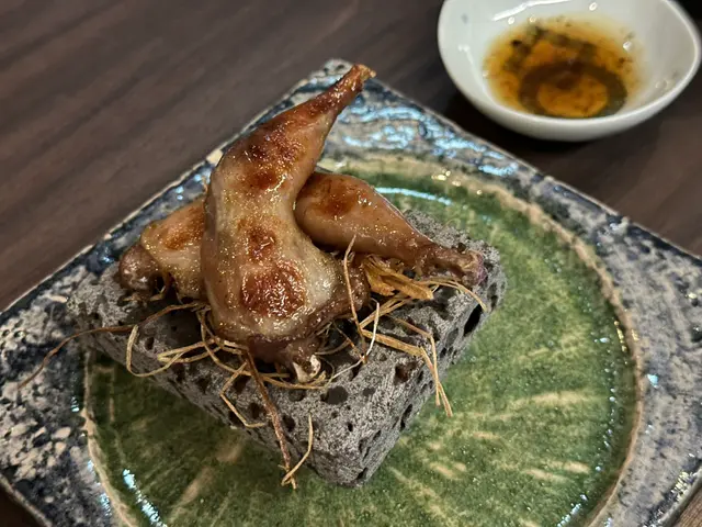 燒物為慢煮法國鵪鶉,前一晚浸秘製醬汁,肉質濃郁嫩滑,京蔥焦糖焦香與山椒汁完美平衡。