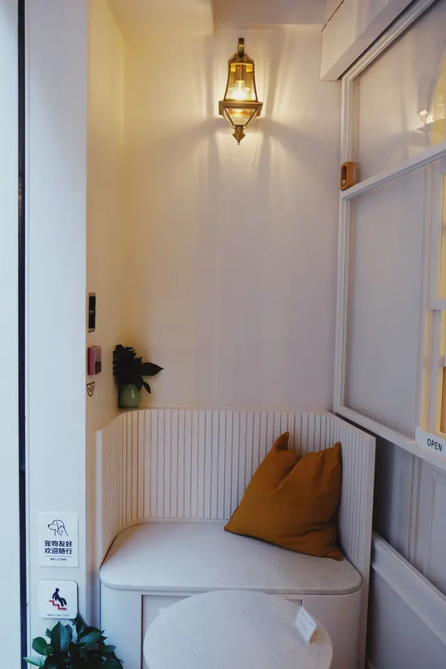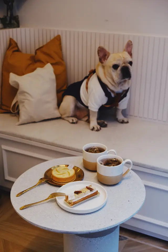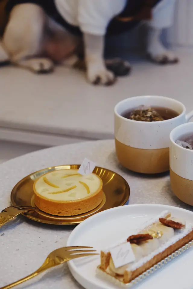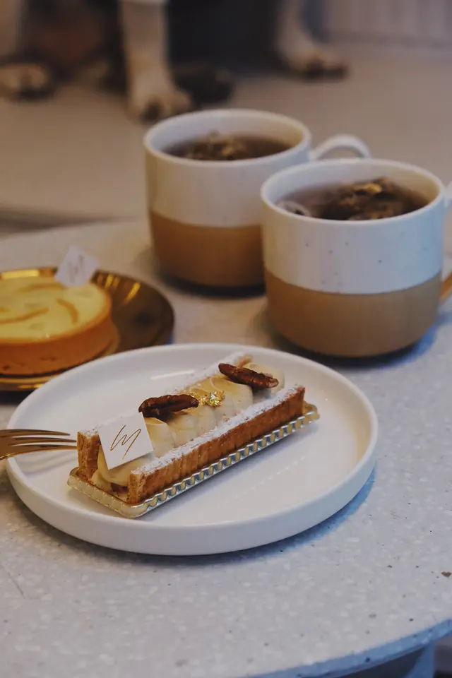 白色既門框下有兩組室外既座位, 食物選擇有鹹甜既選擇, 仲有唔同既茶類同咖啡☕️ 係繁忙既街道旁有間咁寫意既甜品店都幾特別🤓