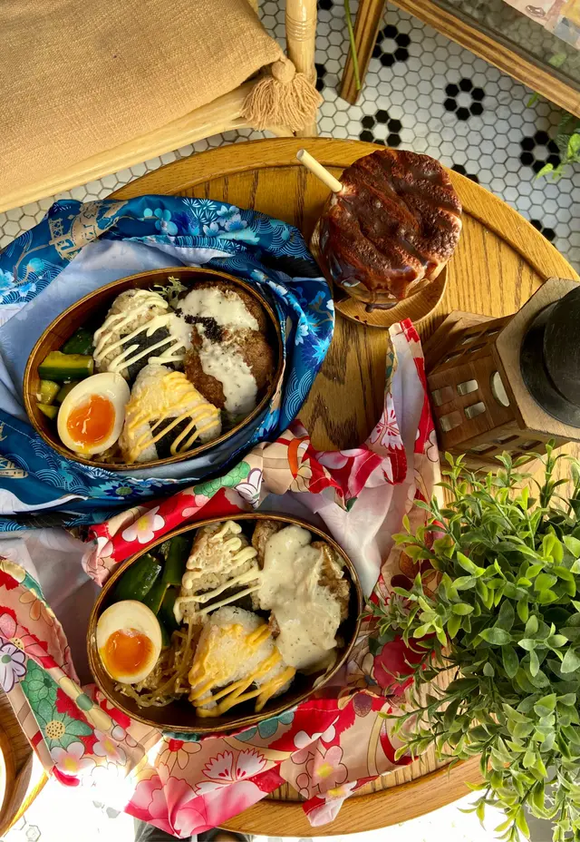 兩款便當其實都好相似,只係主菜唔同!伴菜有醃芽菜青瓜,糖心蛋同沙律菜🥰青瓜既醬汁好好味😋兩個飯團分別係有三文魚同醬油味,如果三文魚既份量可以多啲就好🤣便當真係係個盒到上🍱仲有塊布包住好特別🥰