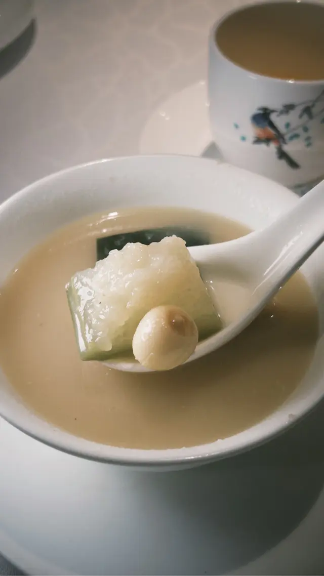 老火湯冬瓜薏米蓮子煲唐排豬𦟌。呢啲湯,最忌就係得表面清潤,實情寡淡如水。呢度嘅湯,色清香濃,唔油膩,一飲落去,真材實料。湯底煲到骨膠溶化,入口軟棉,唐排未化,骨邊啖啖肉,吸晒湯汁,啖啖順喉。今時今日,連煲湯都變得講求成本效率,肯慢慢煲成個下午嘅店,唔多