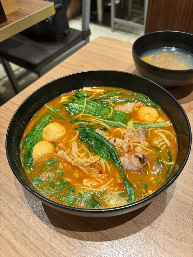 麻辣湯底有四種辣度🌶️揀咗BB辣,香辣惹味!肥牛、魚蛋、牛柏葉、腐竹、油麥菜配玉米麵條,每款食材都充分吸收咗湯底嘅精華,正呀,越食越過癮