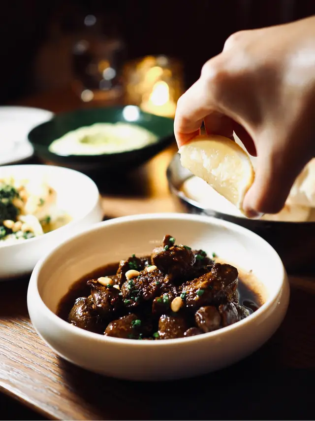 口感軟嫩的雞肝味道濃郁,相對於其他動物肝臟腥味較低,加入微微甘甜的石榴糖蜜交織出濃厚獨特的滋味,滴下新鮮檸檬汁中和肉食的膩感。