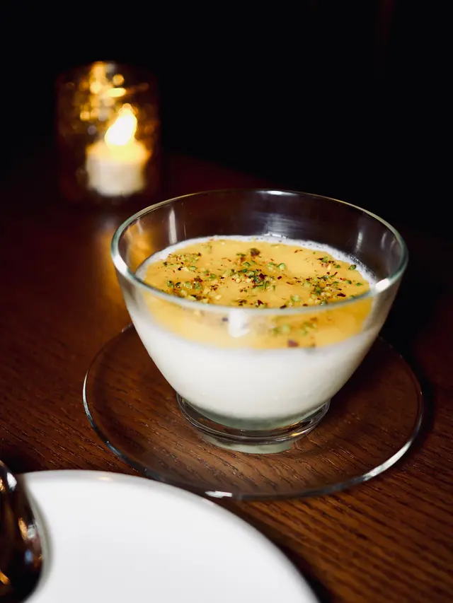 牛奶布甸細緻滑順,奶香濃郁,加入玫瑰花水增添一份清新味道。表面一層香橙蜜餞平衡整體的甜度,更散發柑橘獨特的香氣。