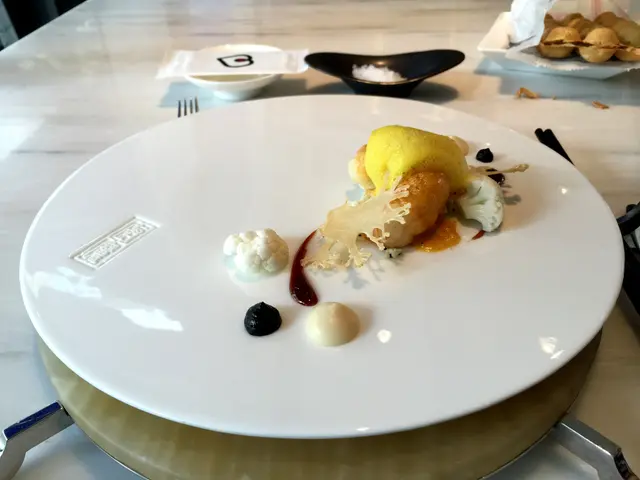 頭盤先點了一款小龍蝦。小龍蝦肉用濃郁的中式咸蛋黃醬緊緊包着,然後再灑上英式芥末醬泡沫,結果成為了這款中西合璧的傑作。
