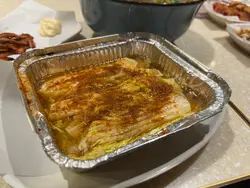 娃娃菜配合蒜蓉、辣粉,放在錫紙兜內燒香。娃娃菜口感清爽,帶少許奶油香氣,微辣鹹香,非常可口