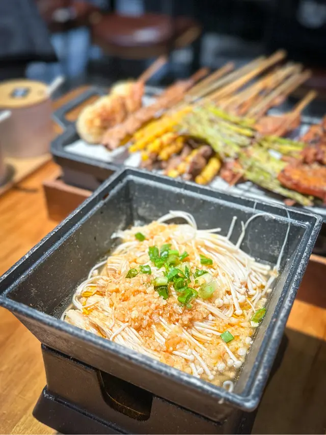 鍋鍋燒系列之一,另起一個爐heat住上,熱湯浸住充滿蒜香嘅金菇,的確係正!