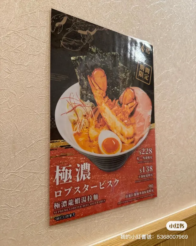 這個期間限定,份量非常夠,配料又足,好吃之糖心蛋和大片慢煮豚肉。龍蝦湯底濃厚,入口滿滿之香味。拉面質軟硬適中,彈牙又掛汁,拉面配料亦豐富,慢煮叉燒肉質滑嫩,口感爽口和半隻糖心蛋~都是最愛吃,拉面湯底味道適中,不會太咸。