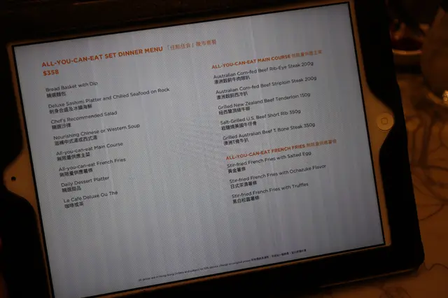 另一款menu係all you can eat形式包括:麵包、刺身盒、冰鎮海鮮、沙律、餐湯、主菜無限量供應、薯條無限量供應、甜品、咖啡/茶,價錢係每位$358。無限量供應主菜有牛肉眼、牛西冷、頂級牛柳、美國牛仔骨、T骨牛扒!如果你係「牛魔王」,又食得多野,就非常抵食喇