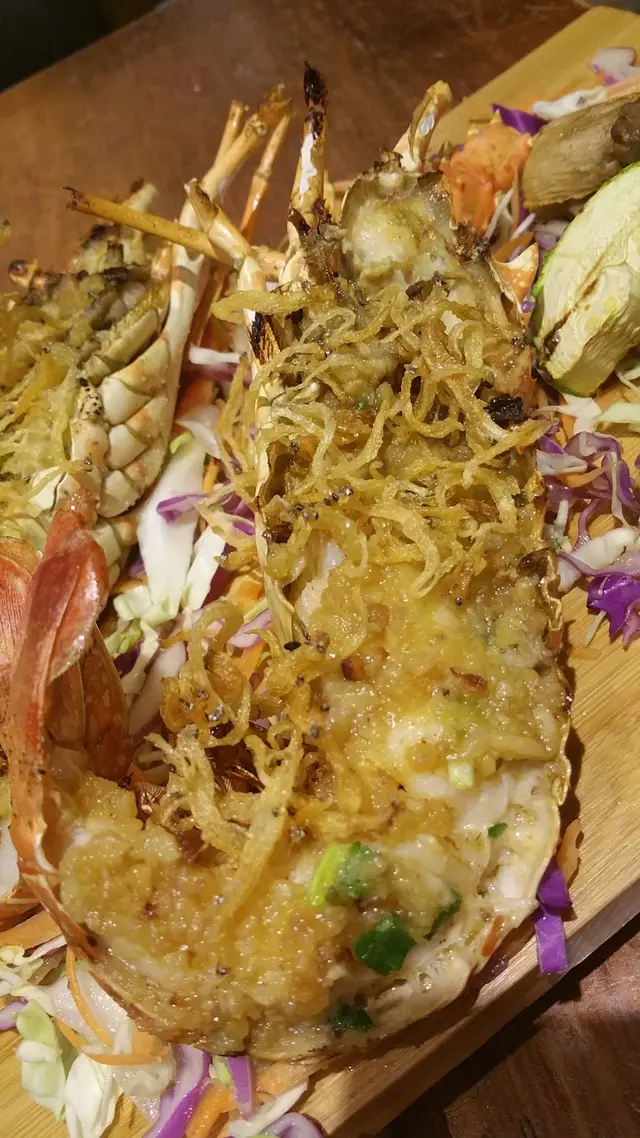 這些的龍蝦有兩款,由於另外一款有臘腸的關係,我選了這一款。比較特別的是,這一款面頭有些白飯魚仔,非常鬆脆。龍蝦果真有11吋長,比我的大手掌還要大。烤過的有陣陣鮮味氣息,重中之重是要蘸上餐廳特有的酸辣汁,馬上起了畫龍點晴之效,毫不誇張!看了看那酸辣汁的成份,有青檸和魚露!難怪!有魚露的地方就有鮮味,青檸的清新和酸味,提振了燒烤食物的滋味!龍蝦啖啖肉,咬落彈牙,頗為新鮮。