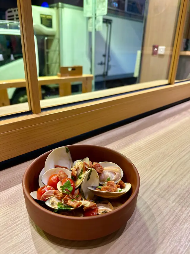 ✨西班牙辣肉腸煮蜆配白酒醬汁:蜆肉鮮甜厚肉,配合辣肉腸、車厘茄及蒜片,美味!