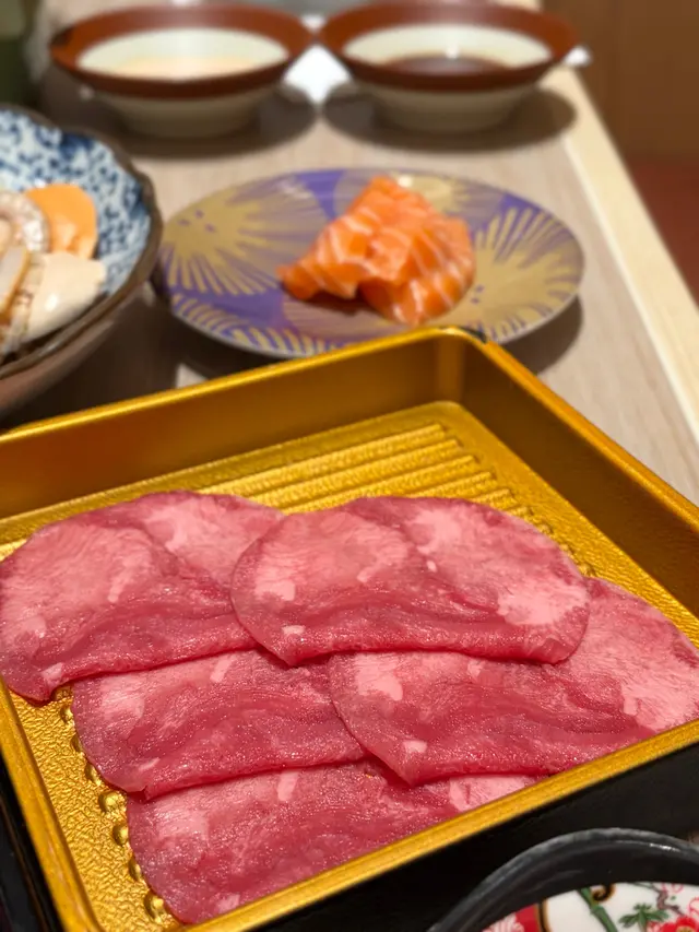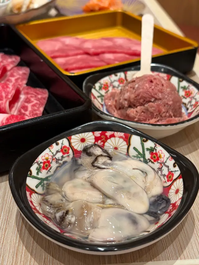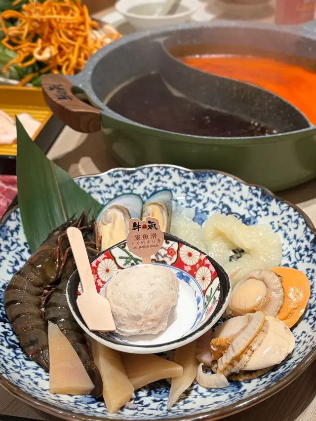 一坐低店員先送上一set肉同海鮮拼盤,安格斯牛、極黑牛油脂分布好靚,輕輕淥6-7秒就食得,牛味香濃,肉質超嫩!肩胛肉就更有咬口,鍾意食牛嘅朋友一定滿足!