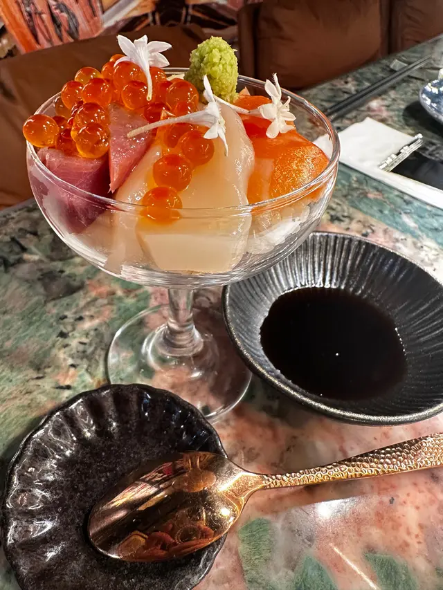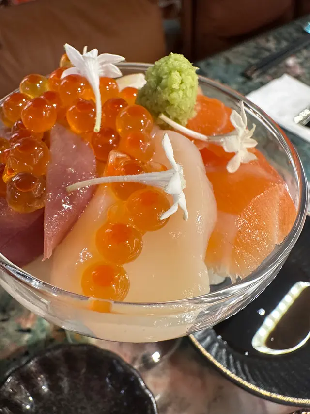 三文魚滑潤、赤身、帶子甘甜,佐以爆漿三文魚籽與米飯,層次豐富。