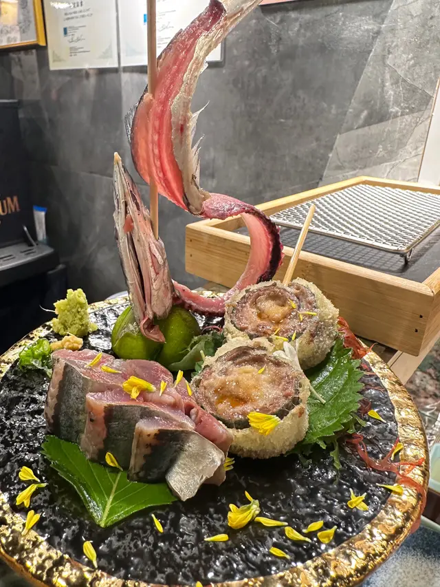 擺設十分漂亮!包含鰻魚、沙椎魚、魷魚、帆立貝等,其中磯煮鮑魚彈牙鮮甜,炸衣輕薄不膩。